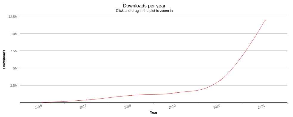 pnpm a été téléchargé environ 3 fois plus en 2021 qu'en 2020 :