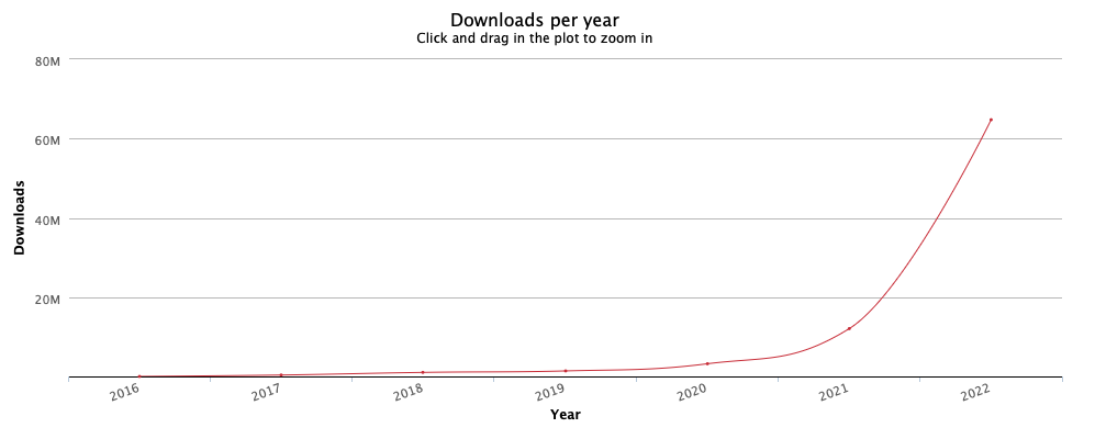 pnpm a été téléchargé plus de 5 fois plus en 2022 qu'en 2021 :